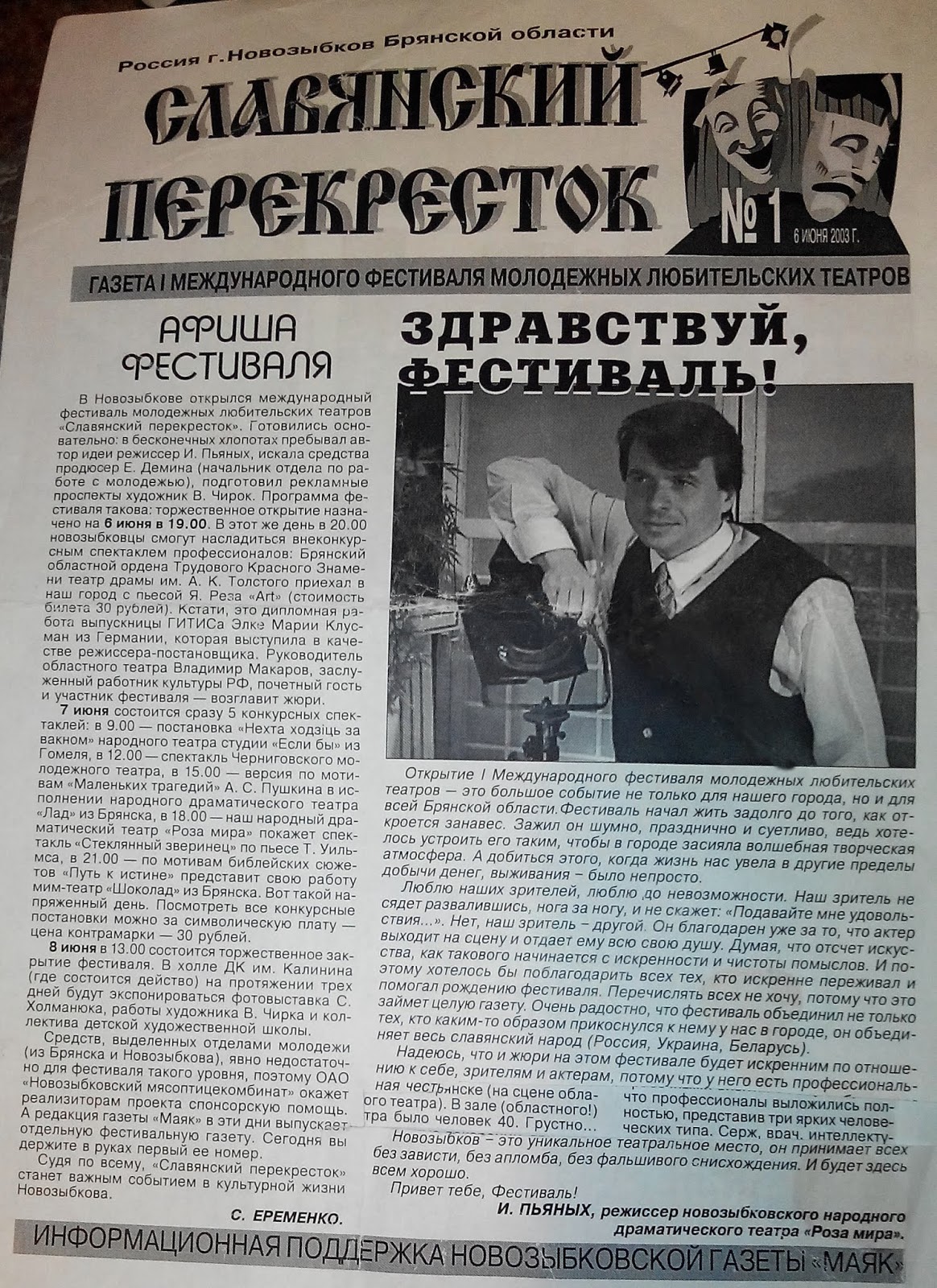 Как сейчас вижу на сцене Елену Демину и Валентина Чирка (оказалось, это 2 фестиваль). Странно, что наша память отчетливо записывает некоторую информацию, а другую стирает. Тогда еще в моей жизни появилось имя Игорь Иванович Пьяных, режиссер театра в Новозыбкове. Поэтому своего старшего сына я без всяких колебаний отдала в детский музыкальный театр - даже тогда, когда он еще до него не дорос. http://tata-libellula.blogspot.com/2016/06/14.html